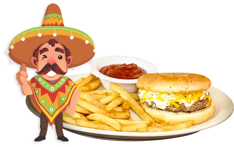 10" flour tortilla filled with shredded chicken or ground beef and cheese, topped with your choice of sauce, served with rice and beans or french fries.