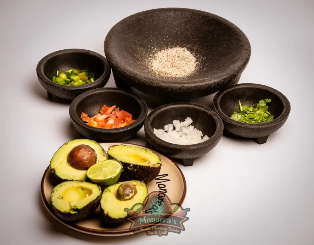 A dish of mashed avocado mixed with chopped onion, tomatoes, cilantro, jalapeño pepper, lime juice and seasoning.